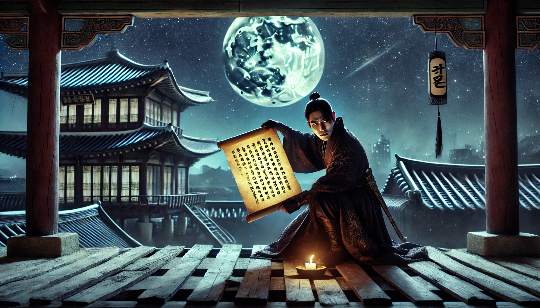 "네가 가진 운명 문서를 내놓아라." 음산한 목소리가 골목 끝에서 들려왔습니다. 검은 도포를 입은 사내였습니다. 그의 손에는 이상하게 빛나는 붓이 들려있었습니다.