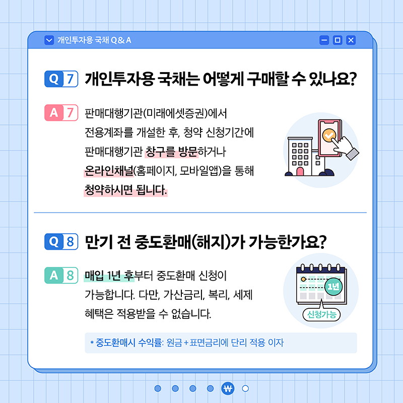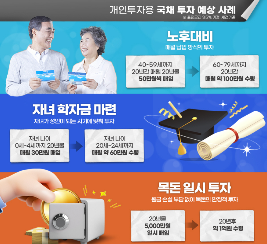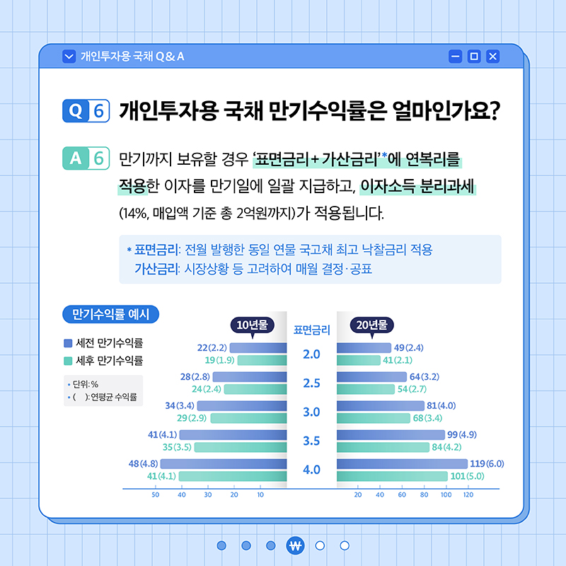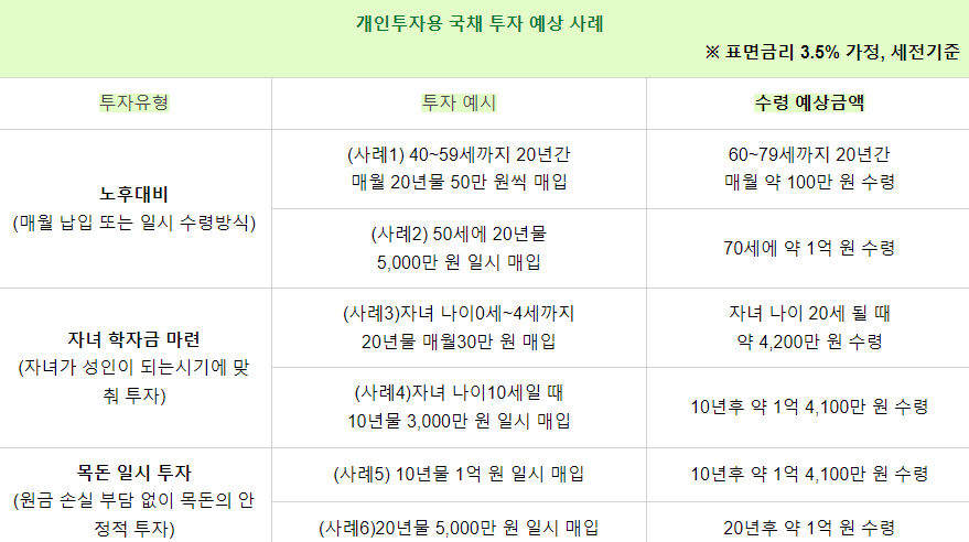 특히 개인투자용 국채는 만기까지 보유하면 표면금리와 가산금리에 연복리를 적용한 이자를 만기일에 일괄 지급하고, 이자소득 분리과세(14%, 매입액 기준 2억 원 한도)를 적용한다.