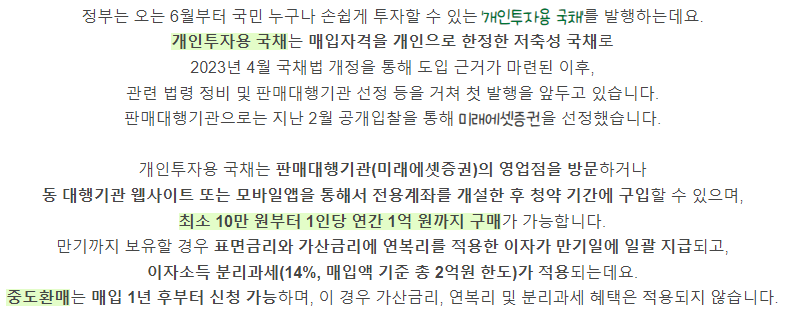 개인투자용 국채는 매입자격을 개인으로 한정한 저축성 국채로, 정부는 지난해 4월 국채법 개정을 통해 도입 근거를 마련했다.