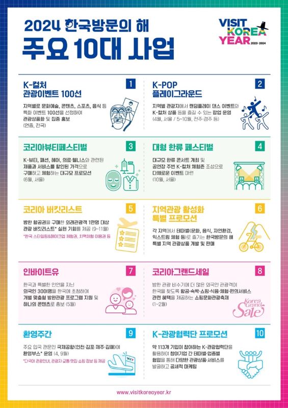 ‘K컬처 관광이벤트 100선’과 연계해 지역관광을 홍보하고, ‘K팝 플레이그라운드’(가칭)와 ‘코리아뷰티페스티벌’, ‘대형 한류 페스티벌’ 등 대규모 행사를 통해 한국 관광을 선보인다. 문화체육관광부는 15일 한국관광공사, 한국방문의해위원회 등 ‘2024 한국방문의 해’ 관계기관 간 1차 회의를 열고 주요 10대 사업의 추진 방향을 점검했다.