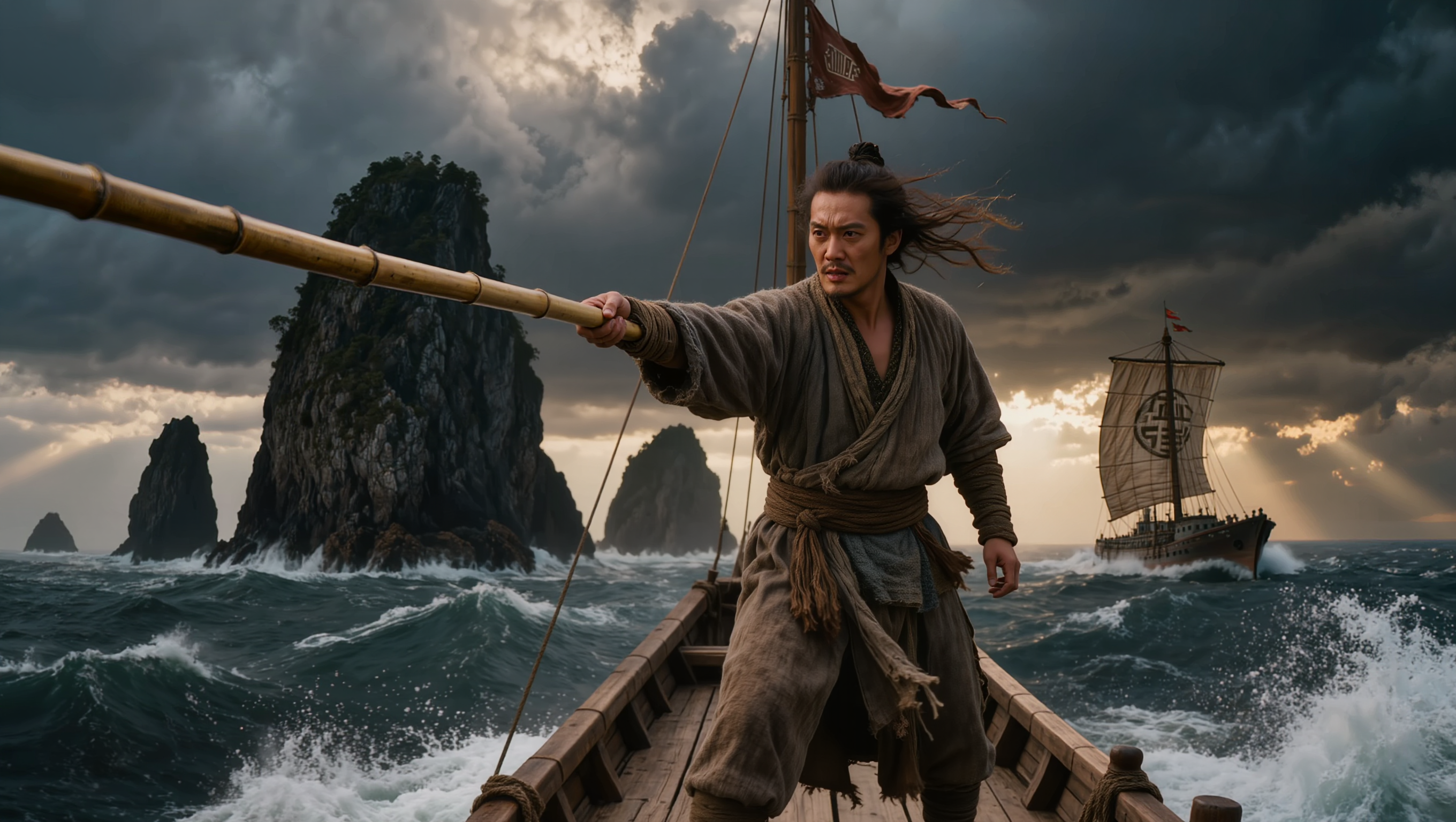 A cinematic, photorealistic 16:9 dramatic scene of a rugged Joseon-era Korean fisherman in his late thirties standing defiantly on the wooden deck of a small traditional Korean fishing boat, his weathered face fierce and resolute, wind whipping through his tied-back hair and worn hemp jeogori. He grips a long bamboo pole, pointing accusingly toward the horizon. Behind him, the rocky volcanic silhouettes of Dokdo islands rise from a stormy East Sea, with crashing waves and dramatic gray storm clouds parting to reveal golden rays of sunlight. In the misty distance, a Japanese vessel retreats. The sea spray glistens, the boat's sail bears traditional Korean character markings (no readable text), and a faded red royal banner flutters at the mast. Cinematic lighting with deep blues, stormy grays, and bursts of warm gold. Ultra-detailed textures of weathered wood, salt-stained fabric, and rough sea waves. Shallow depth of field, hyperrealistic, museum-quality Korean historical drama still. No text, no logo, no watermark. Shot on a medium-format camera, 50mm lens, f/2.8.