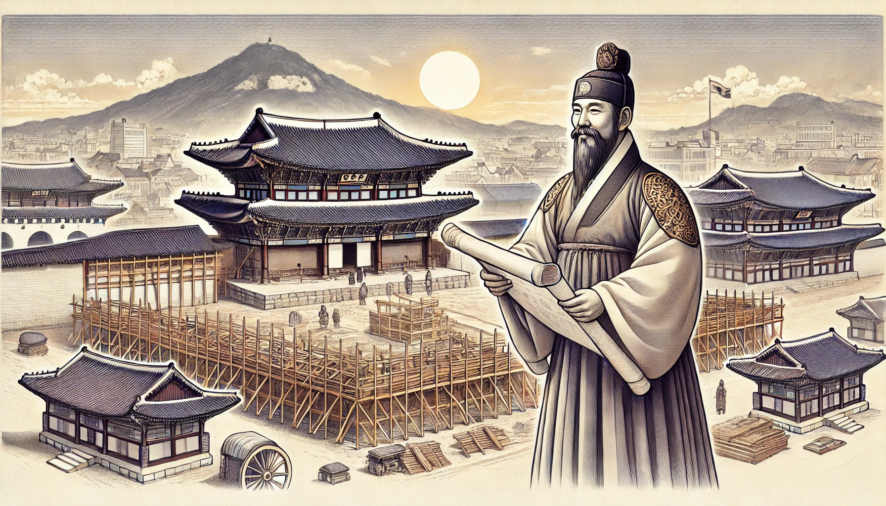 한양으로의 천도와 함께 가장 시급했던 과제는 궁궐의 건설이었습니다. 왕조의 정통성과 권위를 상징하는 가장 중요한 공간인 궁궐은 새 정권의 이념과 비전을 담아내야 했습니다. 정도전은 이 프로젝트의 총책임자로서, 경복궁의 설계와 건설 과정에 깊이 관여했습니다.