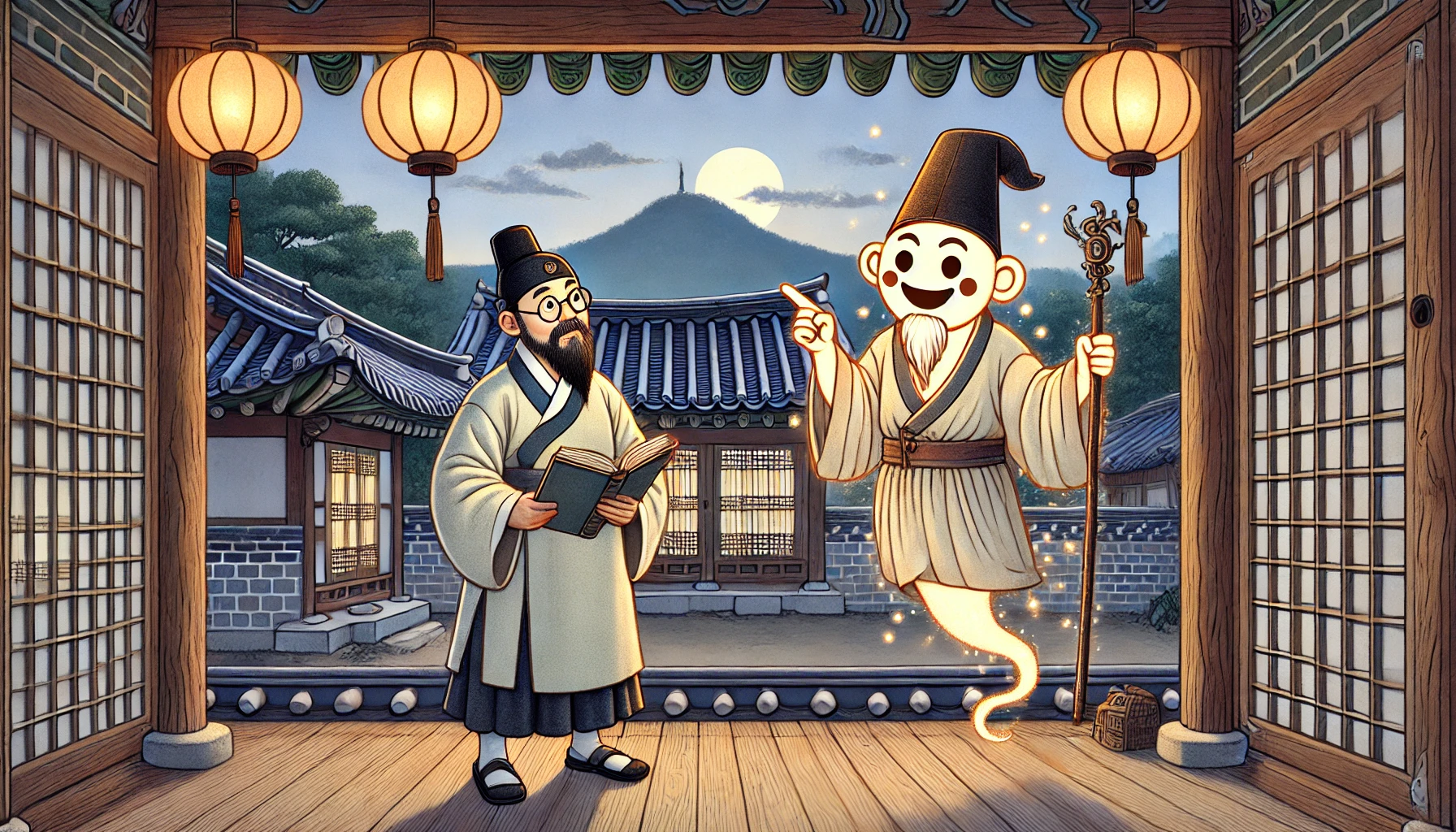 "물론이다! 그런데 말이야, 선비. 자네는 왜 이 밤중에 혼자 남산까지 올라왔나?"
