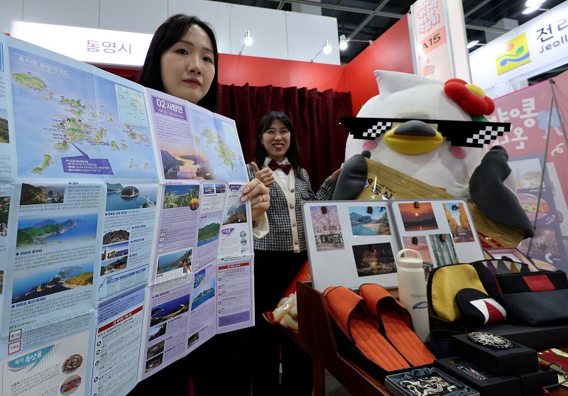 28일 서울 서초구 aT센터에서 열린 2024 내나라 여행박람회에 참가한 통영시 부스 관계자들이 특산물과 관광지를 소개하고 있다.