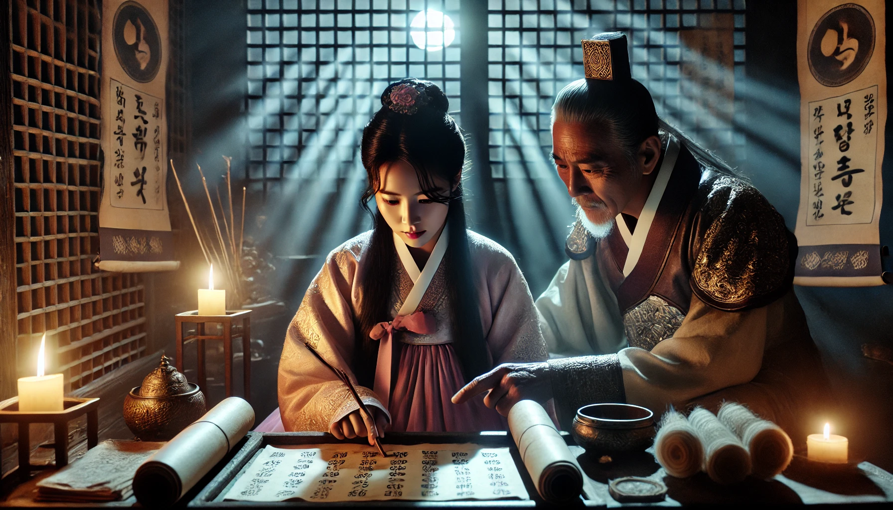 "육 년 전, 궁녀의 사건을 기억하시나요?" 여인의 목소리가 들려왔습니다. 박만수의 얼굴이 창백해졌습니다. 그날 밤, 그가 거짓 증언을 하여 죽음으로 몰아넣었던 그 궁녀가 떠올랐기 때문입니다.