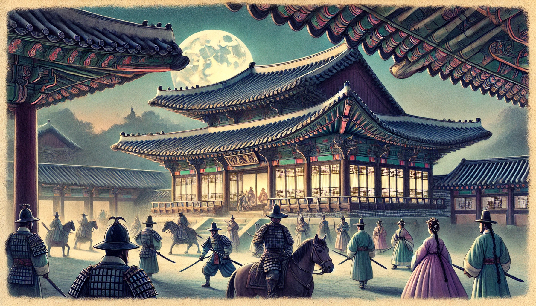 새벽 5시, 이들은 경복궁 광화문에 도착했습니다. "대원군 마마께서 궁궐에 들어가신다!" 선두에 선 조선인이 큰 소리로 외쳤습니다. 궁궐 수비대는 갑작스러운 상황에 당황했습니다. 대원군의 권위 때문에 쉽게 제지할 수 없었기 때문입니다. "어찌된 일입니까?" 수비대장이 물었지만, 이미 무리는 궁궐 안으로 밀려들어가고 있었습니다.