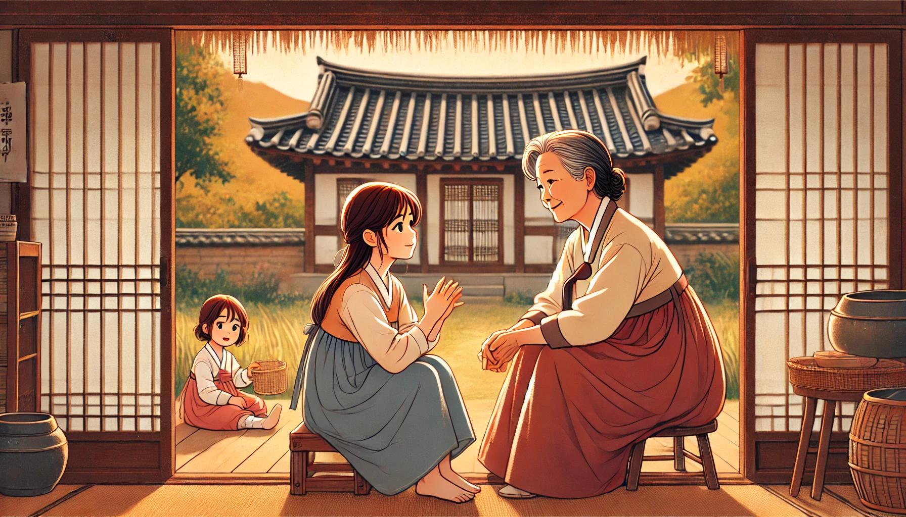 밤이 깊어가고 있었습니다. 시아버지는 먼저 주무시겠다며 방으로 들어갔고, 민지와 시어머니는 따뜻한 보리차를 마시며 마루에 앉아 있었습니다. 밤하늘에는 별이 반짝였고, 시골 마을의 고요함이 마음을 편안하게 해주었습니다.