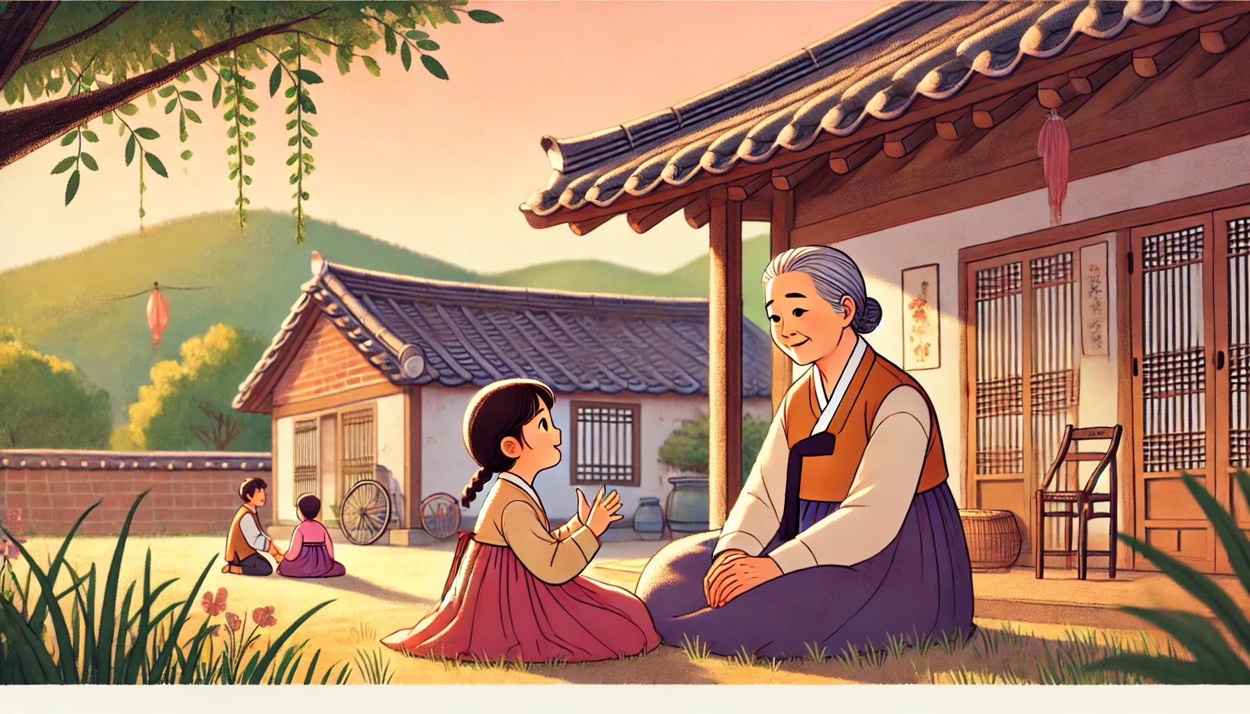마당에서 놀던 수아가 달려와 할머니 무릎에 앉았습니다. "할머니, 배고파요."