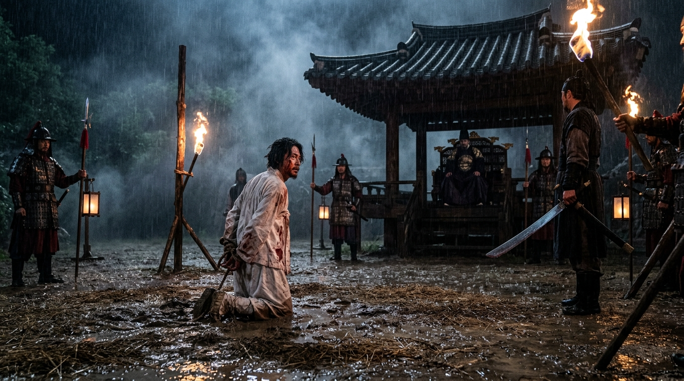 A cinematic, wide-angle 16:9 shot of a gloomy, rain-drenched Joseon Dynasty execution ground at night, illuminated by flickering torchlight. In the center, a noble Korean scholar in torn, blood-stained white hanbok kneels proudly with his head held high, staring fiercely at an imposing, shadowy figure in royal robes seated on a throne in the background. Dense fog, dramatic chiaroscuro lighting, highly detailed, photorealistic, historical accuracy, solemn and tragic atmosphere, no text.