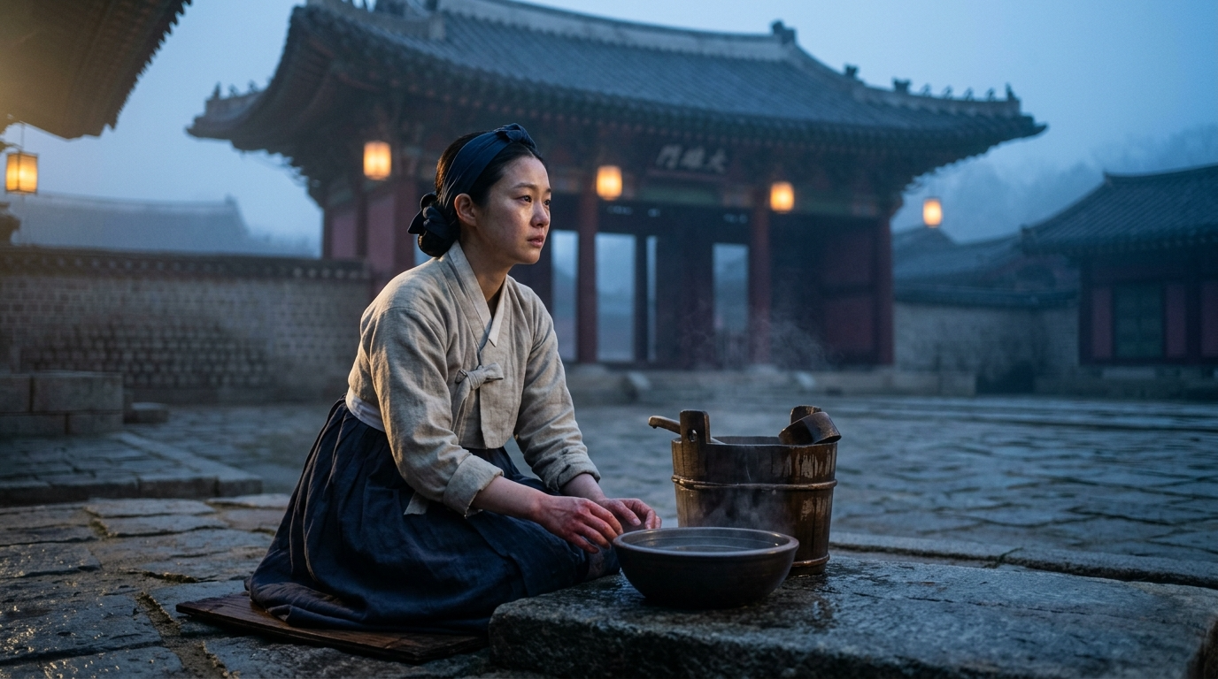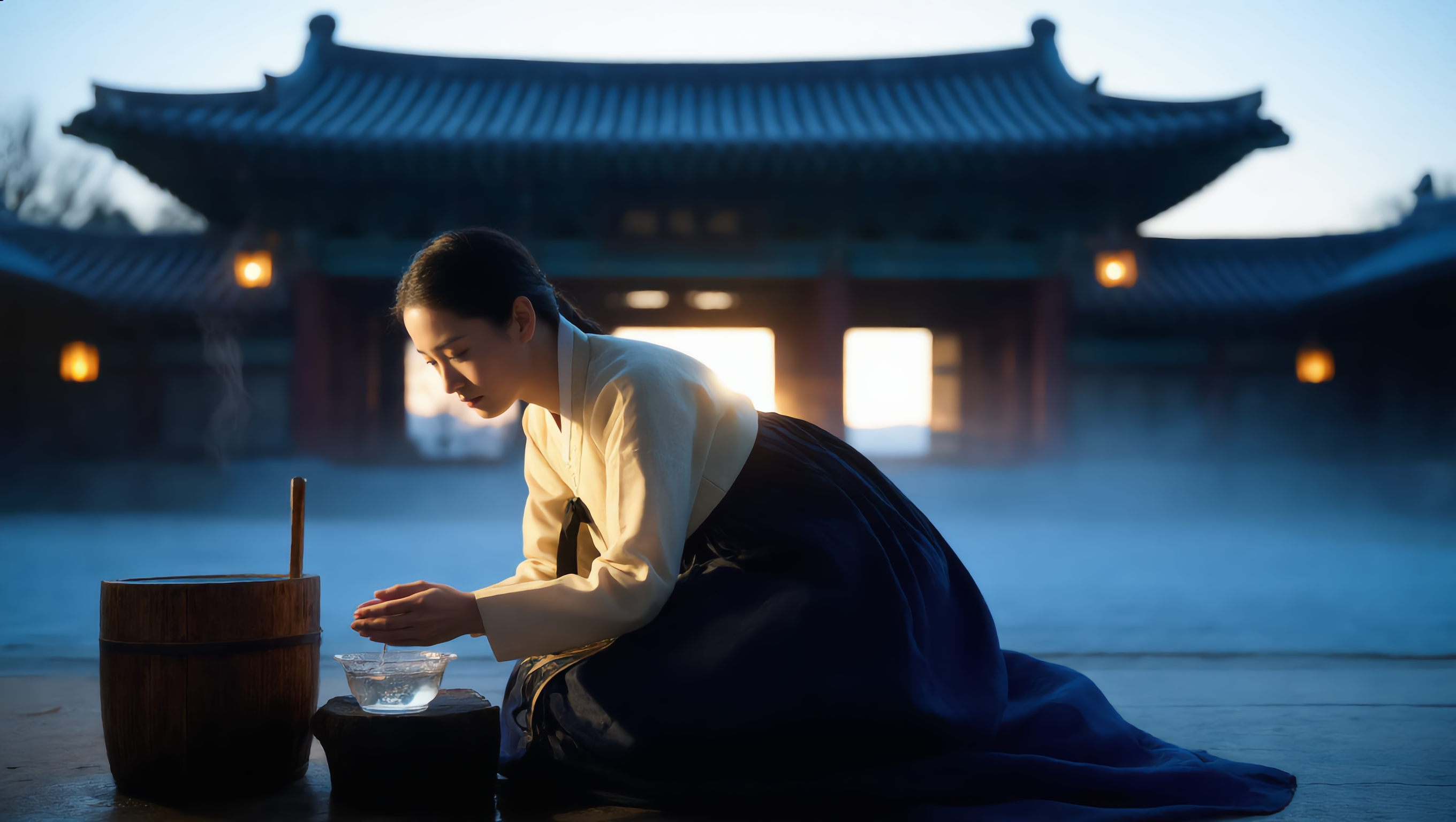 A cinematic, photorealistic 16:9 portrait of a humble yet dignified Korean Joseon-era palace maid in her late twenties, kneeling beside a wooden water bucket in a dim palace courtyard at dawn. She wears a simple pale hemp jeogori and dark indigo chima, her hair tied back with a plain cloth, hands reddened and chapped from cold water. A single bowl of clear water (정화수) sits on a low stone platform before her, faint steam rising in the cold morning air. Behind her, the silhouette of a grand Joseon palace gate with red pillars and tiled roof emerges from the blue pre-dawn mist, paper lanterns glowing softly in amber. Her face is illuminated by a single shaft of golden sunrise light, expression quietly resolute, eyes brimming with unspoken emotion. Ultra-detailed skin texture, fine fabric weave, shallow depth of field, moody cinematic color grading with deep blues, warm ambers, and soft whites. No text, no logo, no watermark. Shot on a medium-format camera, 85mm lens, f/1.8, hyperrealistic, museum-quality historical drama still.