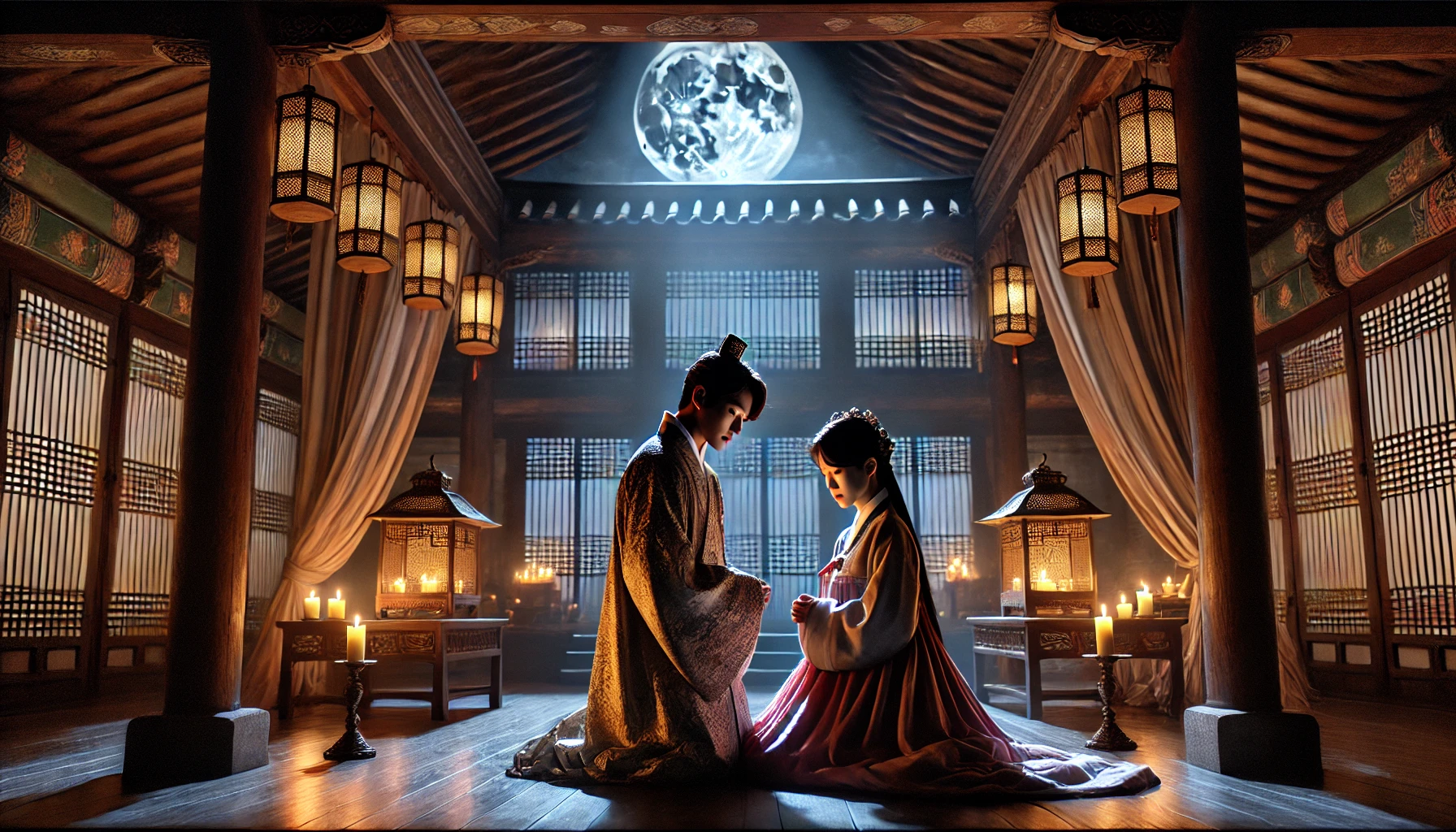 그녀의 목소리가 끝나기도 전에 양녕대군은 참을 수 없는 충동을 느꼈습니다. 그는 조심스럽게 그녀의 턱을 들어 올렸고, 그들의 입술이 만났습니다. 처음에는 가볍게 스치듯이, 그리고 점점 더 깊어지는 키스였습니다.
