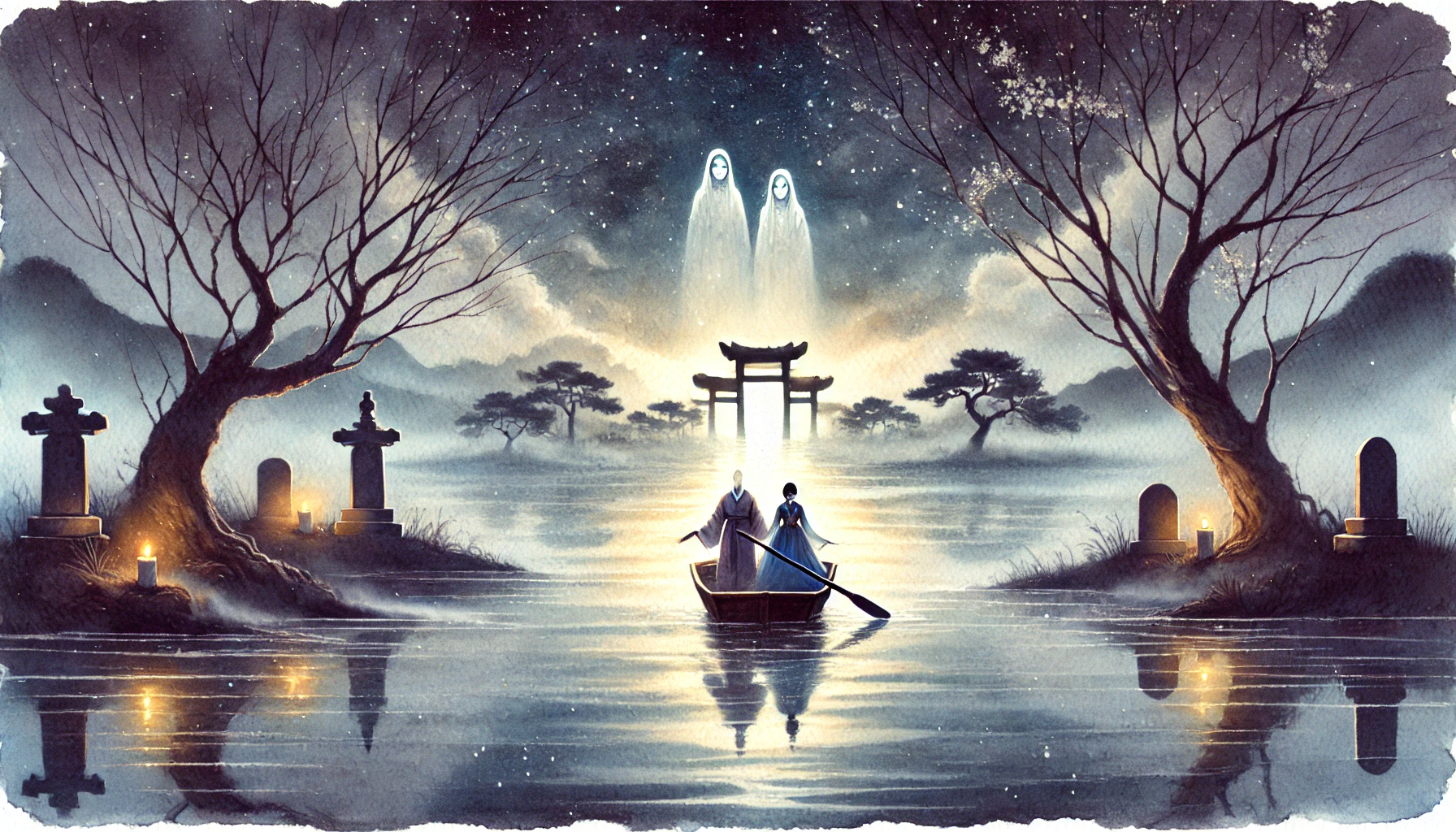 칠흑 같은 어둠이 드리워진 강 위, 고요함만이 가득했다. 바람 한 점 없는 공간에선 오직 물결이 배를 타고 흐르는 소리만이 메아리쳤다. 한줄기 차가운 기운이 두 혼령의 뺨을 스쳤고, 남자는 서늘한 감촉에 몸을 움츠렸다. 그러나 그의 손은 허공만을 가를 뿐, 그 어떤 것도 느껴지지 않았다.
