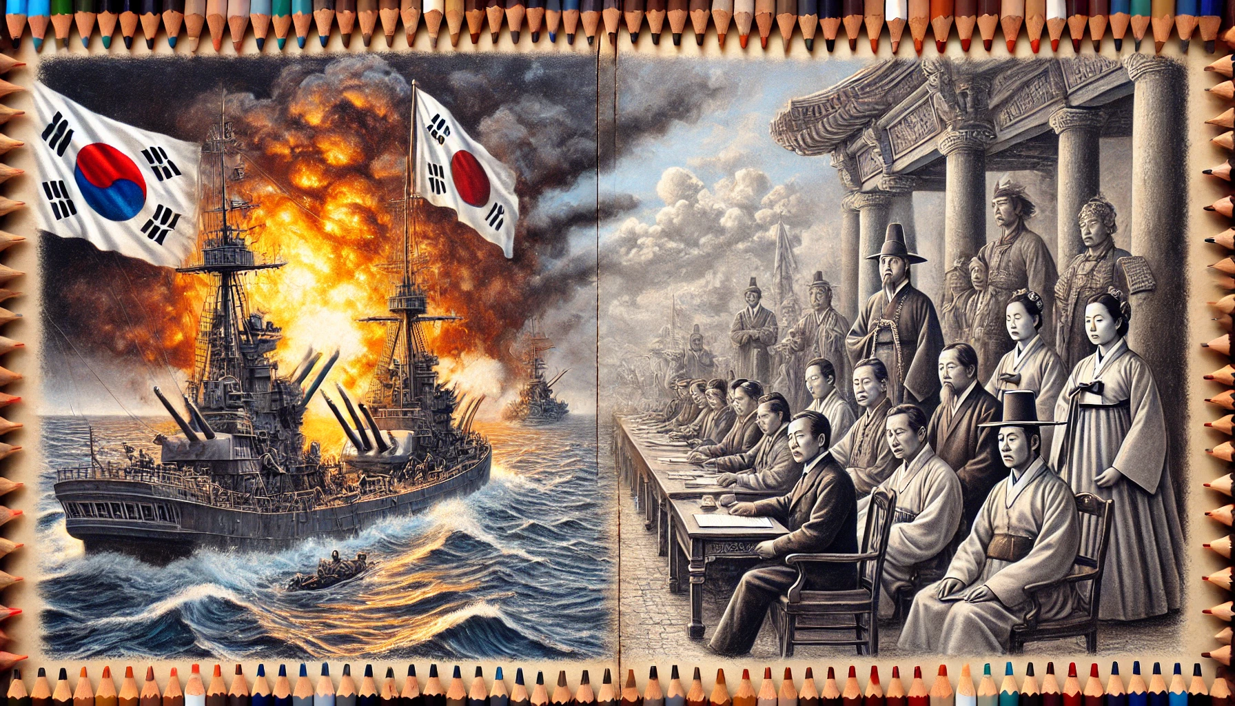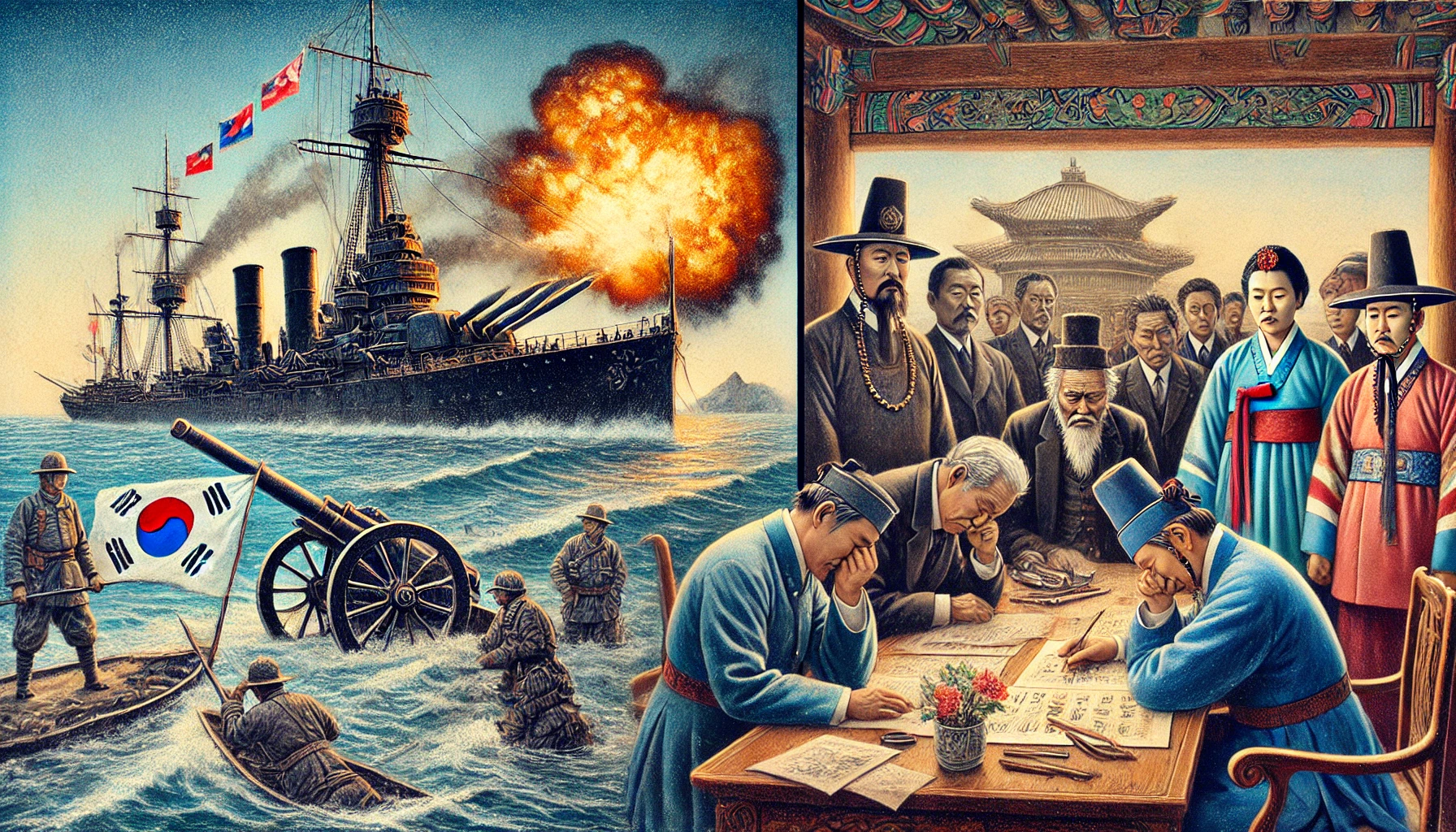 바다 너머로 일본 군함들이 승리의 기적을 울리며 돌아가고 있었습니다. 그 소리는 조선의 새로운 시대가 시작되었음을 알리는 신호였습니다. 하지만 그것이 희망찬 미래를 의미하는지, 아니면 굴욕의 시작을 알리는 것인지는 아무도 알 수 없었습니다.