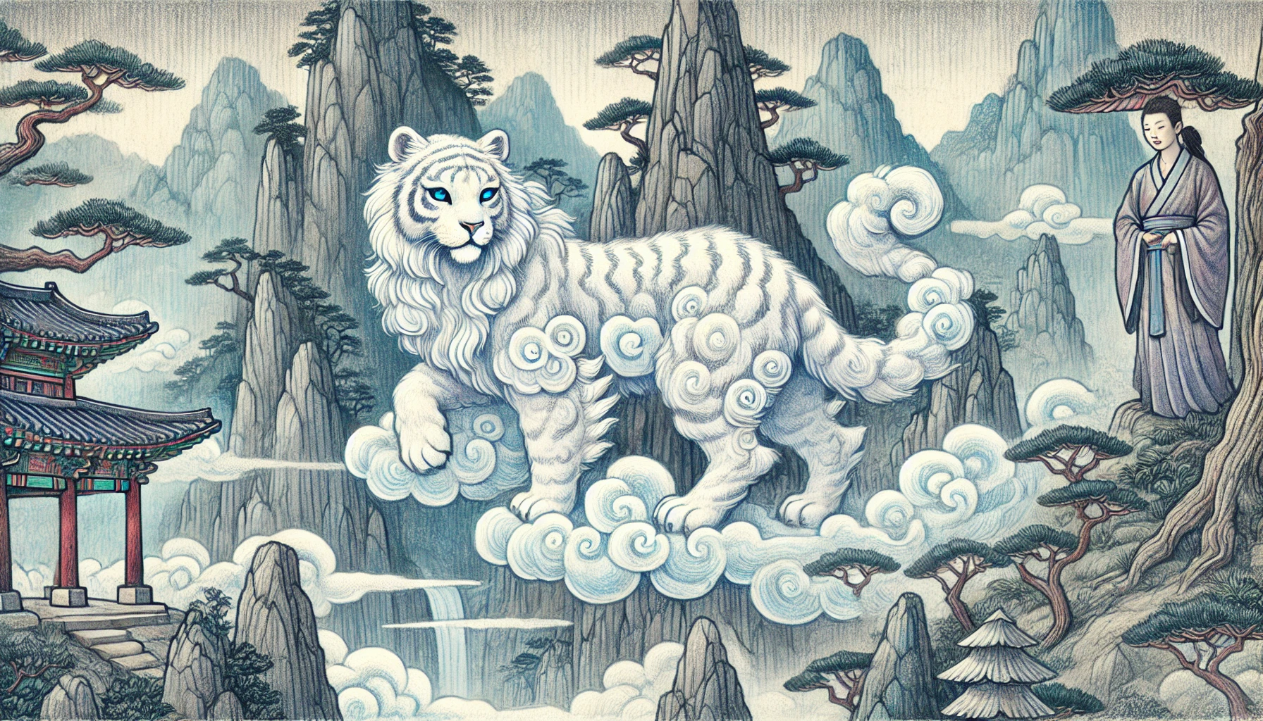 달빛 아래 거대한 형체가 나타났습니다. 처음에는 구름인가 싶었는데, 자세히 보니 하얀 호랑이였습니다. 그런데 이상했습니다. 그 호랑이의 몸에서는 구름처럼 안개가 피어올랐고, 발자국마다 하늘에서 이슬이 내렸기 때문입니다.