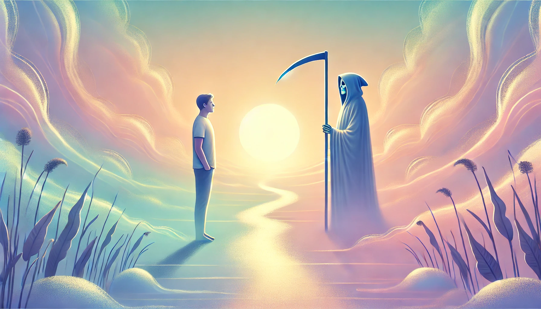 저승사자는 고요히 고개를 끄덕이며 뒷걸음질 쳤다. 그의 모습은 점차 빛 속으로 희미해져 갔지만, 그의 목소리는 마지막으로 주인공에게 닿았다.