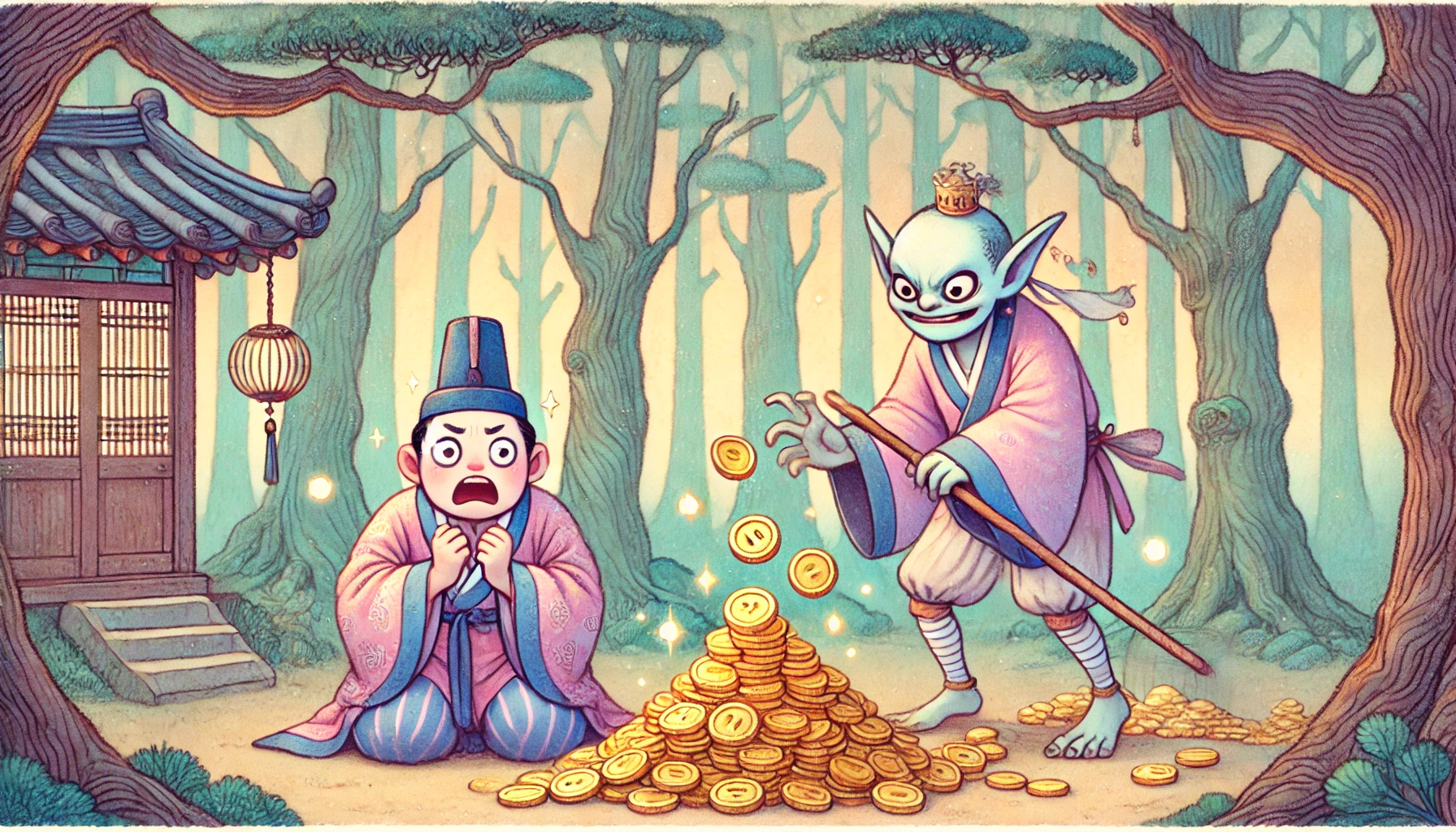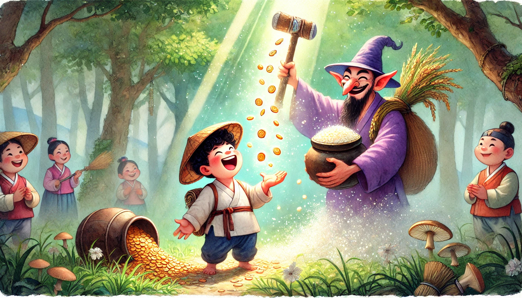 하지만 욕심으로 가득 찬 그의 마음을 알아챈 방망이는 갑자기 빛을 잃더니, 황금 대신 온갖 쓰레기와 돌멩이를 쏟아내기 시작했습니다. 창고는 무너지고, 부자는 그 밑에 깔려 비명을 질렀습니다.