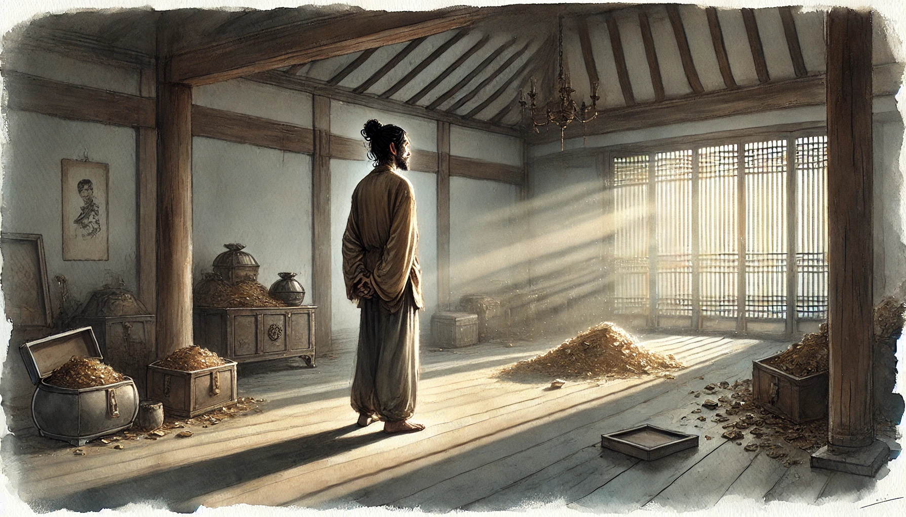 욕심 많은 부자의 창고는 쓰레기와 돌멩이로 가득 차며 점점 무너져 내렸습니다. 부자는 자신이 무엇을 잘못했는지 깨닫지 못한 채 황금이 아닌 쓰레기 더미 속에서 허우적댔습니다. 그 순간, 방 안이 갑자기 어두워지더니 어디선가 낮게 울리는 목소리가 들려왔습니다.