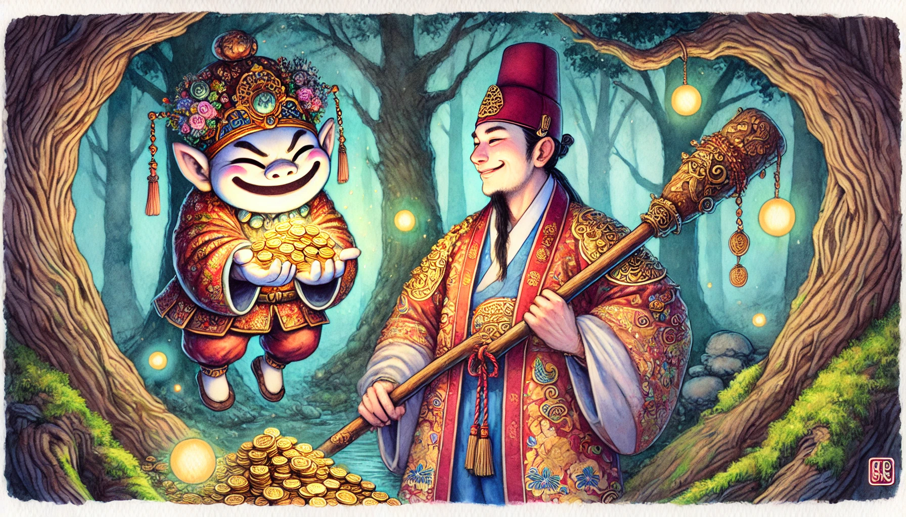옛날 옛적, 깊은 산골에 도깨비가 살고 있었습니다. 사람들에게 장난을 치곤 하지만, 어쩌면 세상 누구보다도 관대했던 존재, 도깨비. 그들이 가진 가장 큰 비밀은 바로 도깨비 방망이였습니다. 이 방망이는 사람의 마음에 따라 복을 내리거나 벌을 내리는 마법의 도구였죠.