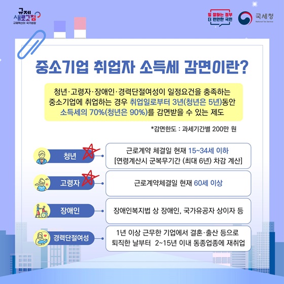 청년·고령자·장애인·경력단절여성이 일정요건을 충족하는 중소기업에 취업하는 경우 취업일로부터 3년(청년은 5년)동안 소득세의 70%(청년은 90%)를 감면받을 수 있는 제도