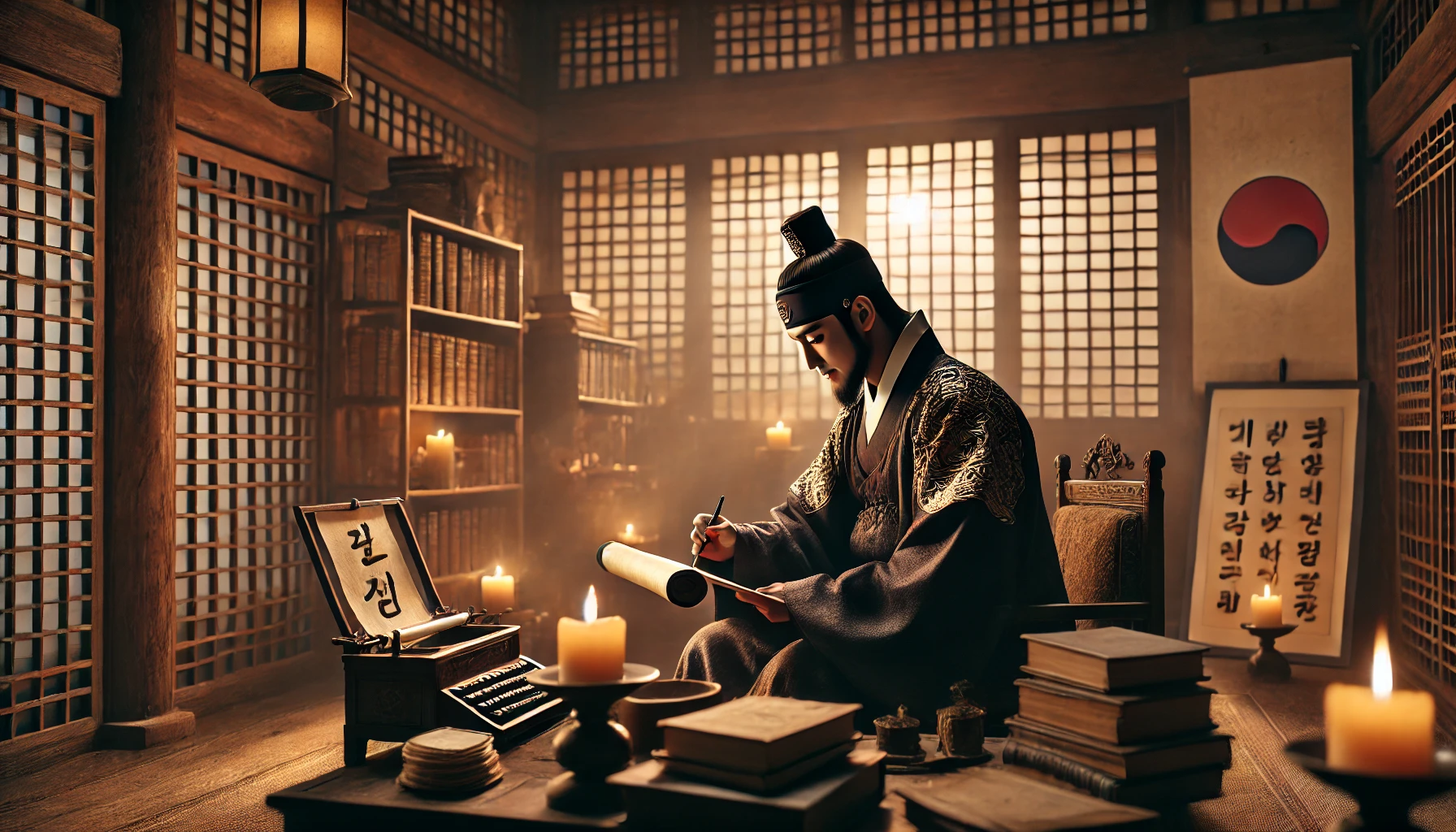 1420년, 조선의 수도 한양의 경복궁 편전. 세종은 신하들과 함께 국정을 논의하던 중 문득 창밖을 바라봅니다. 궁궐 밖 백성들의 삶이 그의 마음에 무겁게 내려앉습니다.