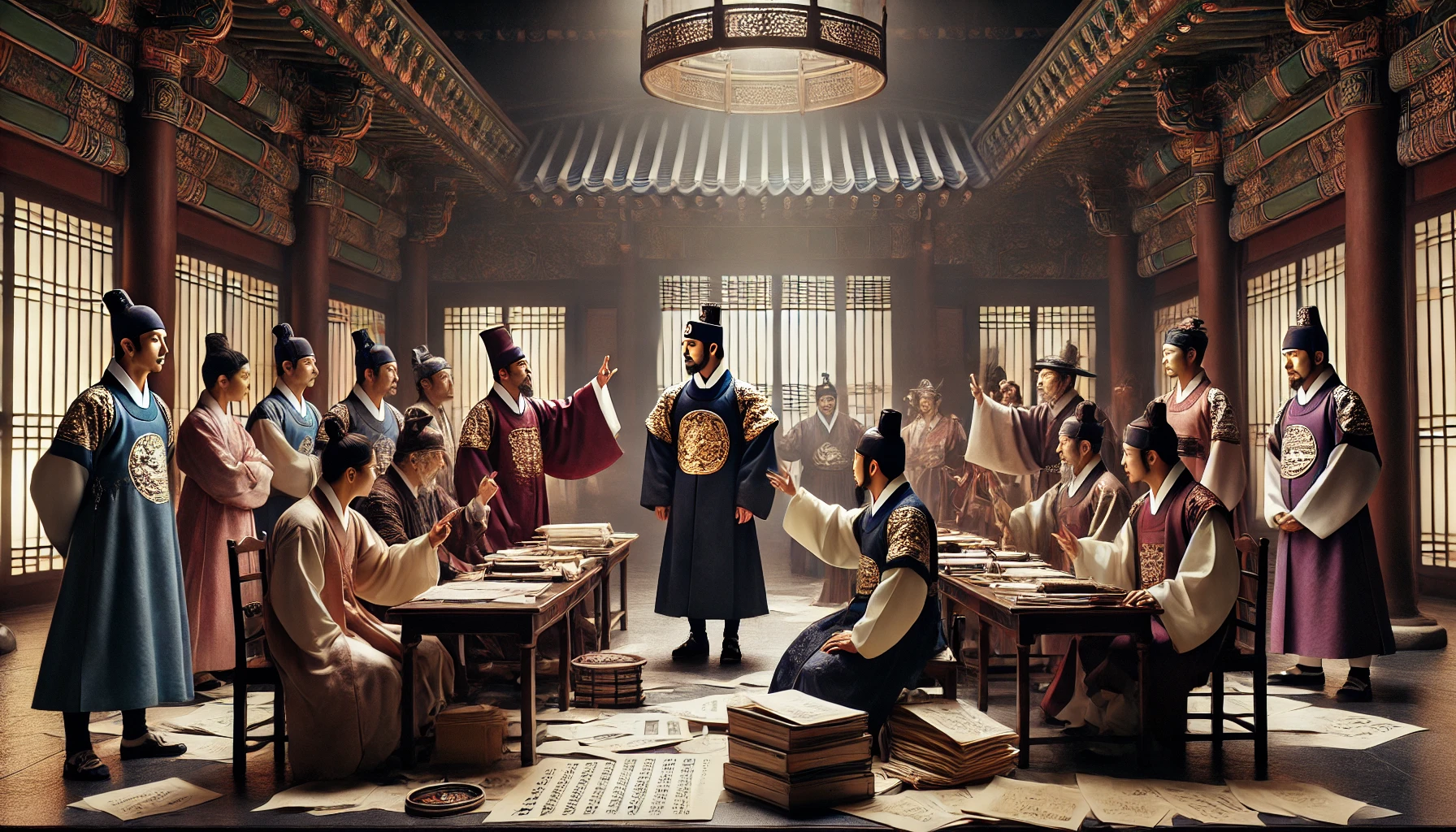 세종의 반문에 최만리와 그의 동료들은 침묵했습니다. 세종은 냉정하지만 단호한 태도로 반대파를 설득하기 시작했습니다.