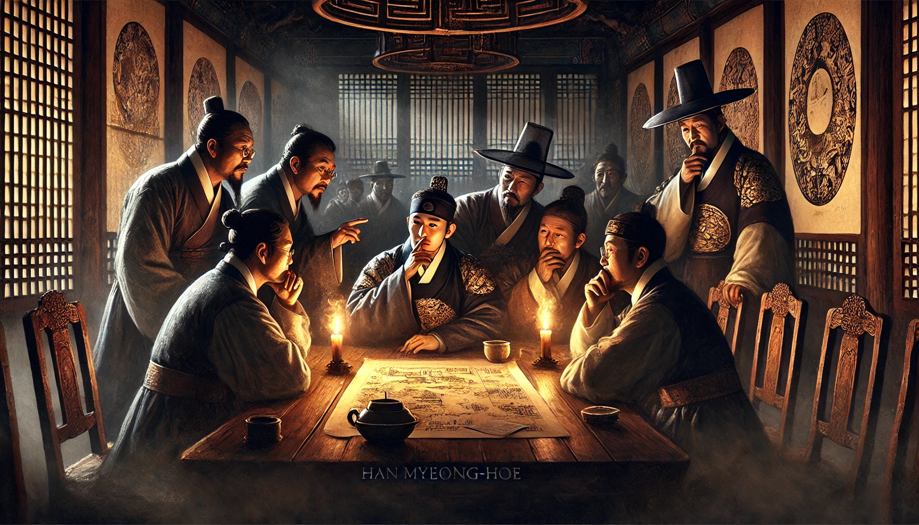 단종 3년, 계유년(1453년) 10월의 서늘한 밤. 한명회의 저택 깊숙한 곳에서 은밀한 모임이 열리고 있었다. 방 안에는 수양대군을 중심으로 정인지, 한확, 권람 등 핵심 인물들이 모여 있었다. 촛불이 일렁이는 가운데, 한명회는 마지막 계획을 설명하고 있었다.