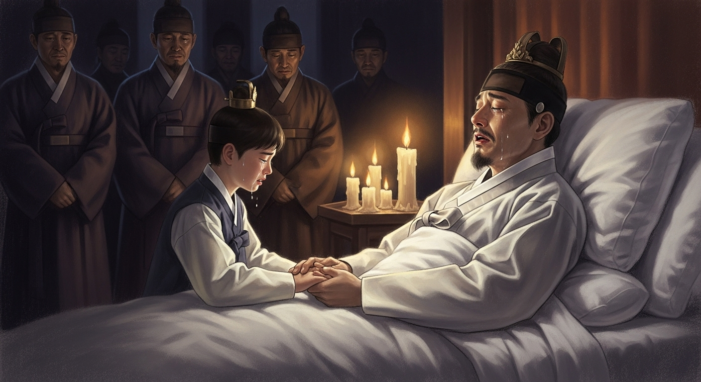며칠 후, 문종의 병세가 위독해졌습니다. 의식이 흐려졌습니다. 눈을 감았다 뜨기를 반복했습니다. 가족들이 모였습니다. 단종이 아버지 손을 꼭 잡았습니다. "아바마마, 가지 마세요."