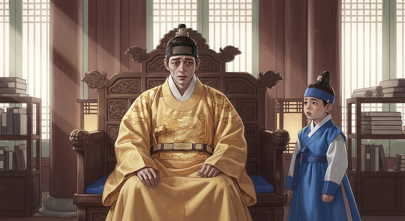 열두 살 단종이 왕위에 올랐습니다. 어린 얼굴에 왕관을 썼습니다. 너무 컸습니다. 왕좌에 앉았습니다. 몸이 작아 보였습니다. 신하들이 걱정스러운 눈으로 바라봤습니다.