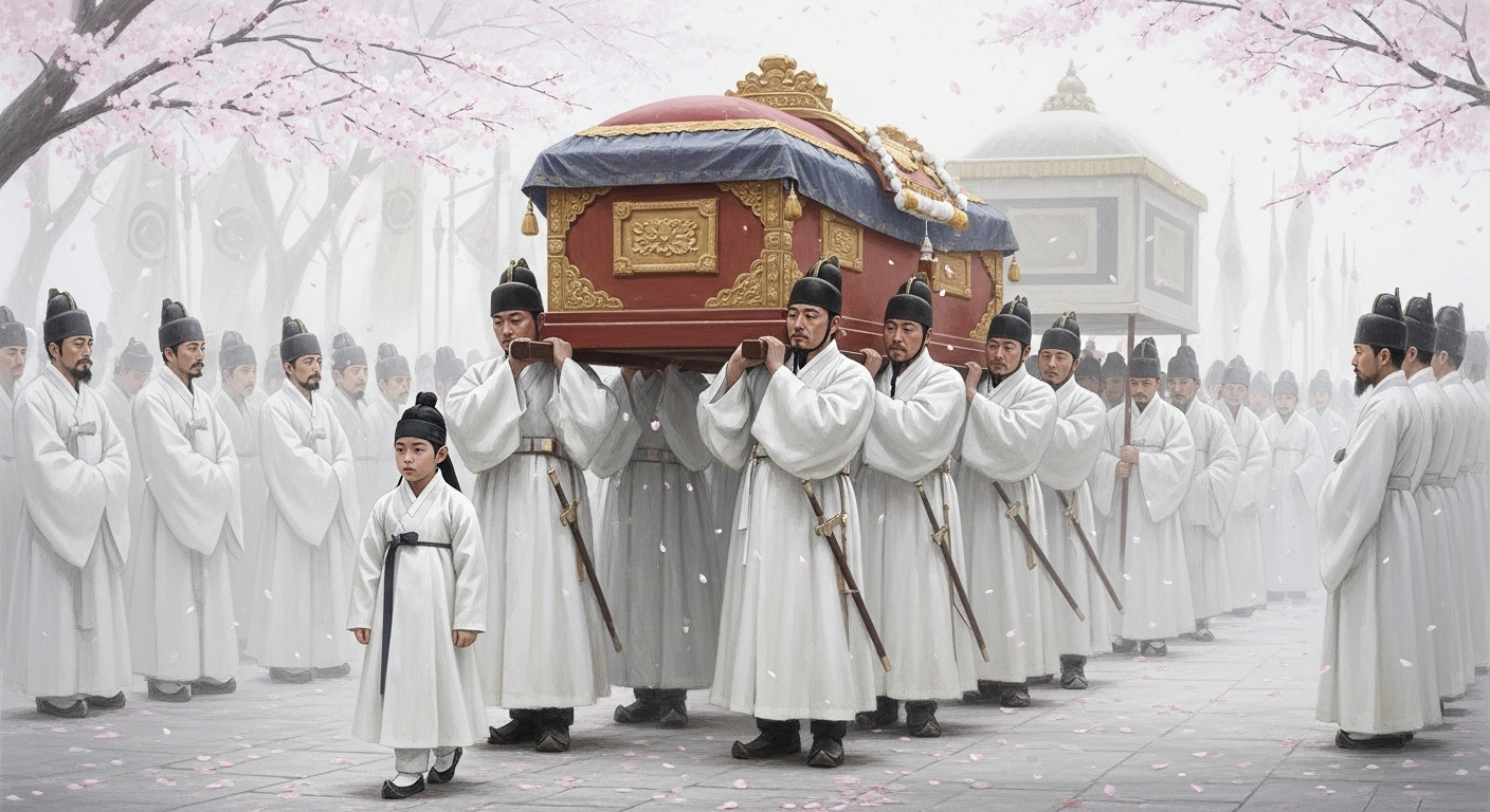 A tragic pastel painting of the funeral procession. King Munjong's ornate wooden coffin carried by palace guards in white mourning clothes. Young King Danjong (age 12) in white mourning robes walking behind, looking lost and small. Court officials in white lining the path. Cherry blossom petals falling like tears. Misty morning atmosphere. Sorrowful and ceremonial mood. Color palette: whites, pale grays, soft pinks (blossoms), muted golds (coffin decorations), gentle mists. Traditional Korean royal funeral, deeply sad atmosphere, delicate brushstrokes, 16:9 format, pastel painting.