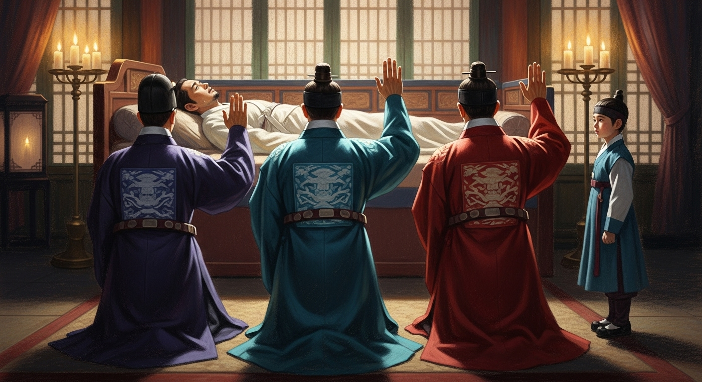 다음 날, 문종은 다시 대신들을 불렀습니다. 침상 곁에 황보인, 김종서, 정분이 섰습니다. 문종이 힘겹게 말했습니다. "경들, 세자를 부탁하오. 아직 어리니, 섭정을 해주시오."