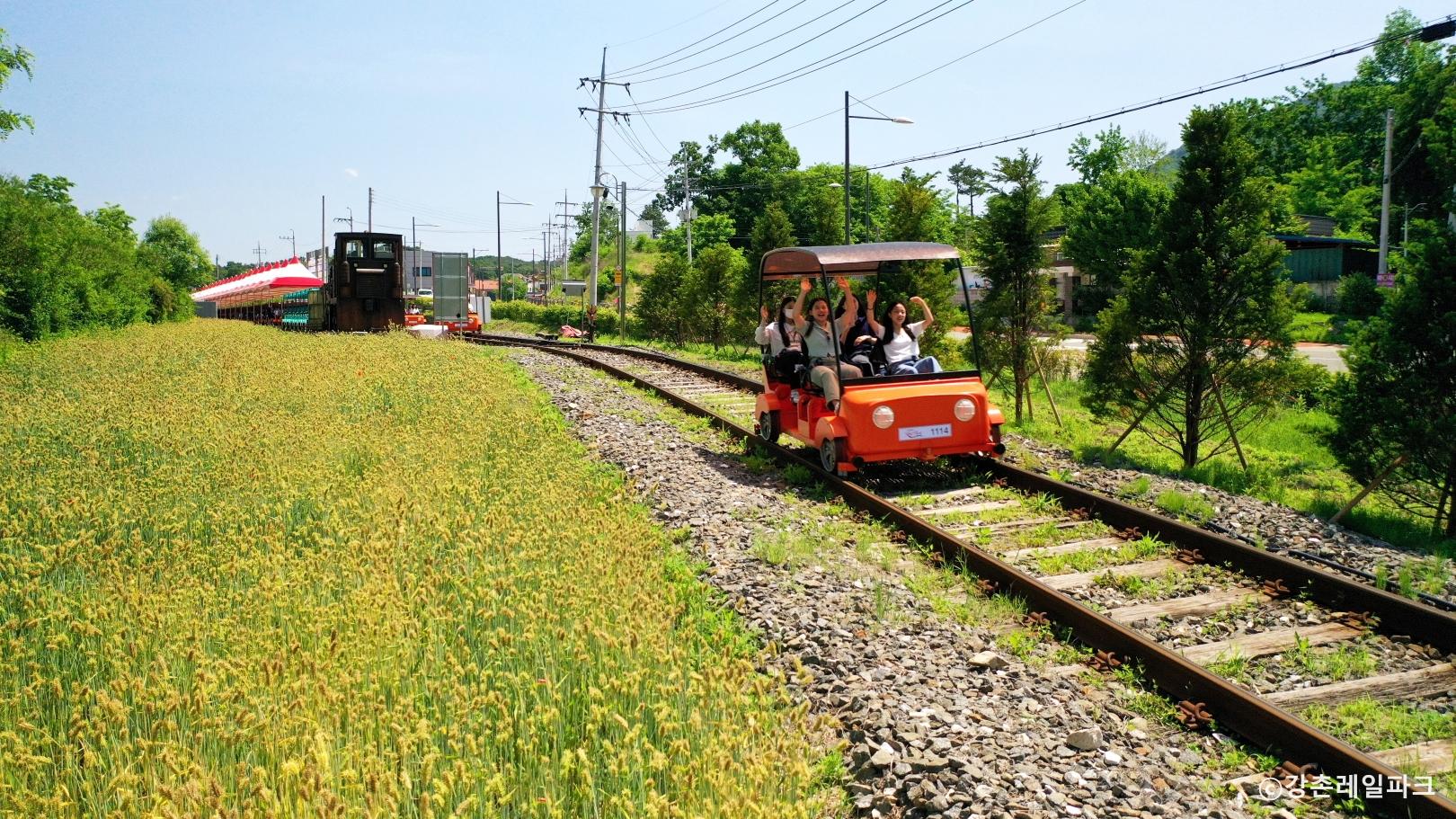 옛 경춘선은 무궁화호가 덜컹이며 낭만을 싣고 달리던 길이다. 그 기찻길을 이제는 레일바이크가 달린다. 강촌레일파크는 옛 경춘선 일부 구간을 이용한 두 개의 노선과 세 개의 출발역이 있다. 출발역을 기준으로 김유정 레일바이크와 가평 레일바이크, 경강 레일바이크로 구분한다. 김유정 레일바이크는 전체 8.5km 코스로 레일바이크로 6km 지점 낭구마을까지 간 뒤 낭만열차로 갈아타고 옛 강촌역까지 간다. 강촌역에서는 셔틀버스를 이용해 출발점인 김유정역으로 돌아온다.